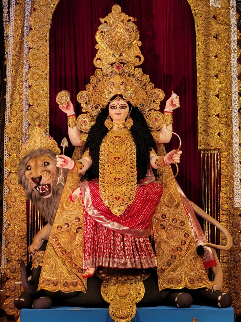 - দেবীর চার হাত, সিংহ বসন ও হস্তিমুণ্ডের প্রতীকী অনুকরণ রয়েছ—মহিষাসুরের বধের পরে অহংকার ভঙ্গের প্রতীক।